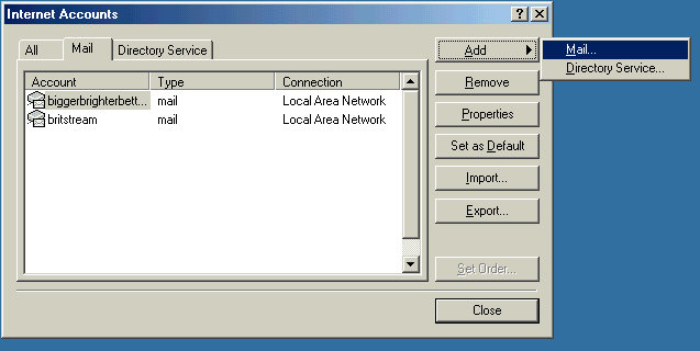 The following images will take you through the process of setting up email an account for your new domain name hosted by Britstream using Microsoft Outlook 2000 as an email client.