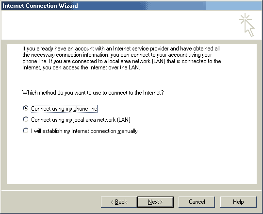 7. If you have a dial-up account, select "Connect using my phone line", otherwise select the appropriate option.